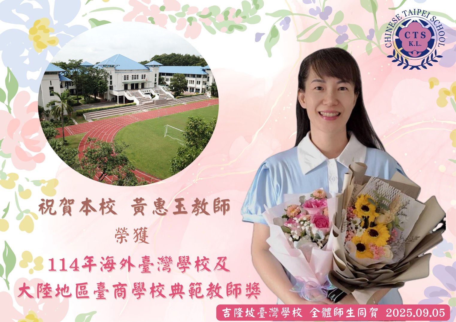 恭喜本校黃惠玉教師榮獲114年海外臺灣學校及大陸地區臺商學校典範教師獎