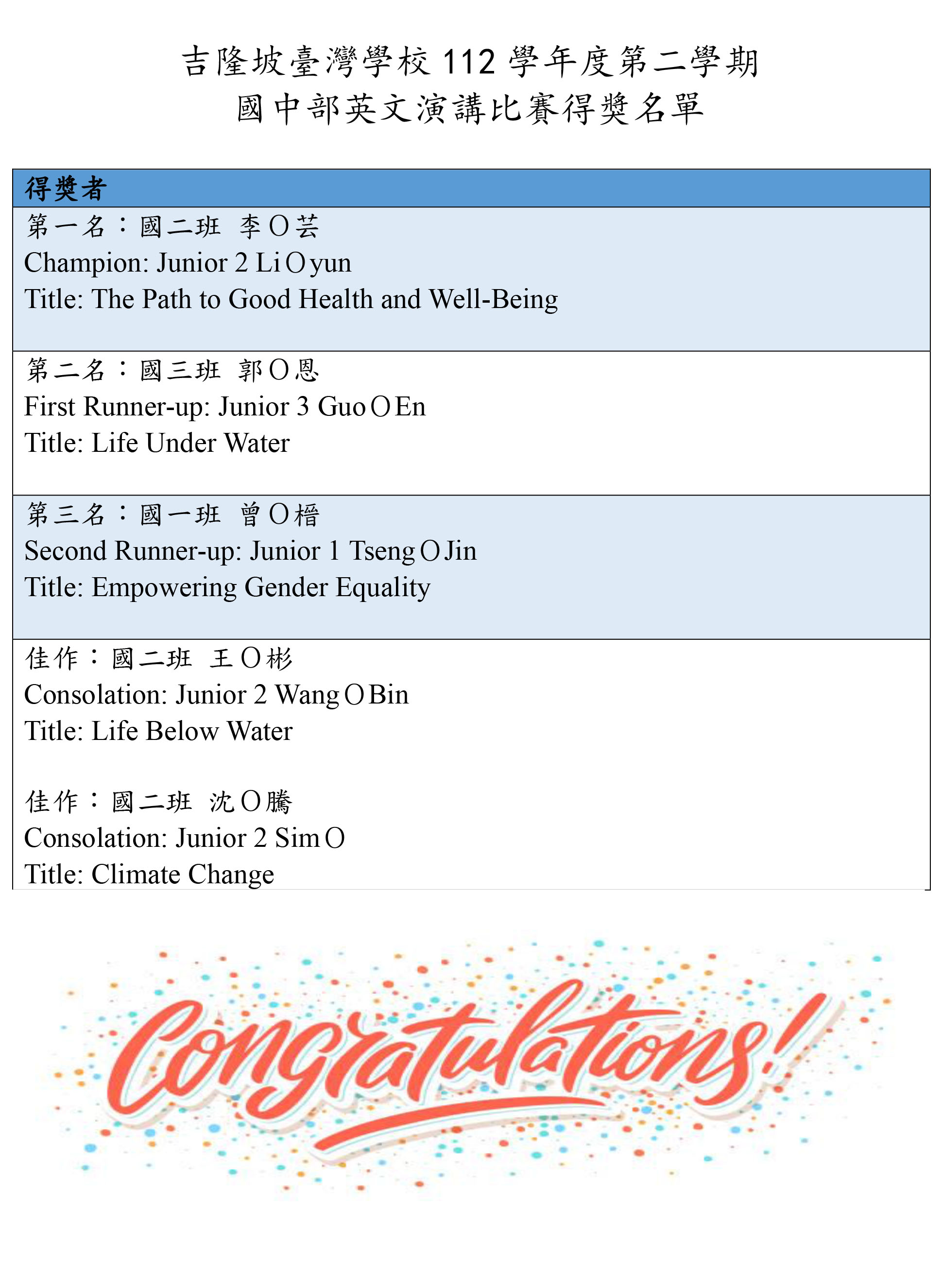 / 吉隆坡臺灣學校112學年度第二學期 國中部英文演講比賽