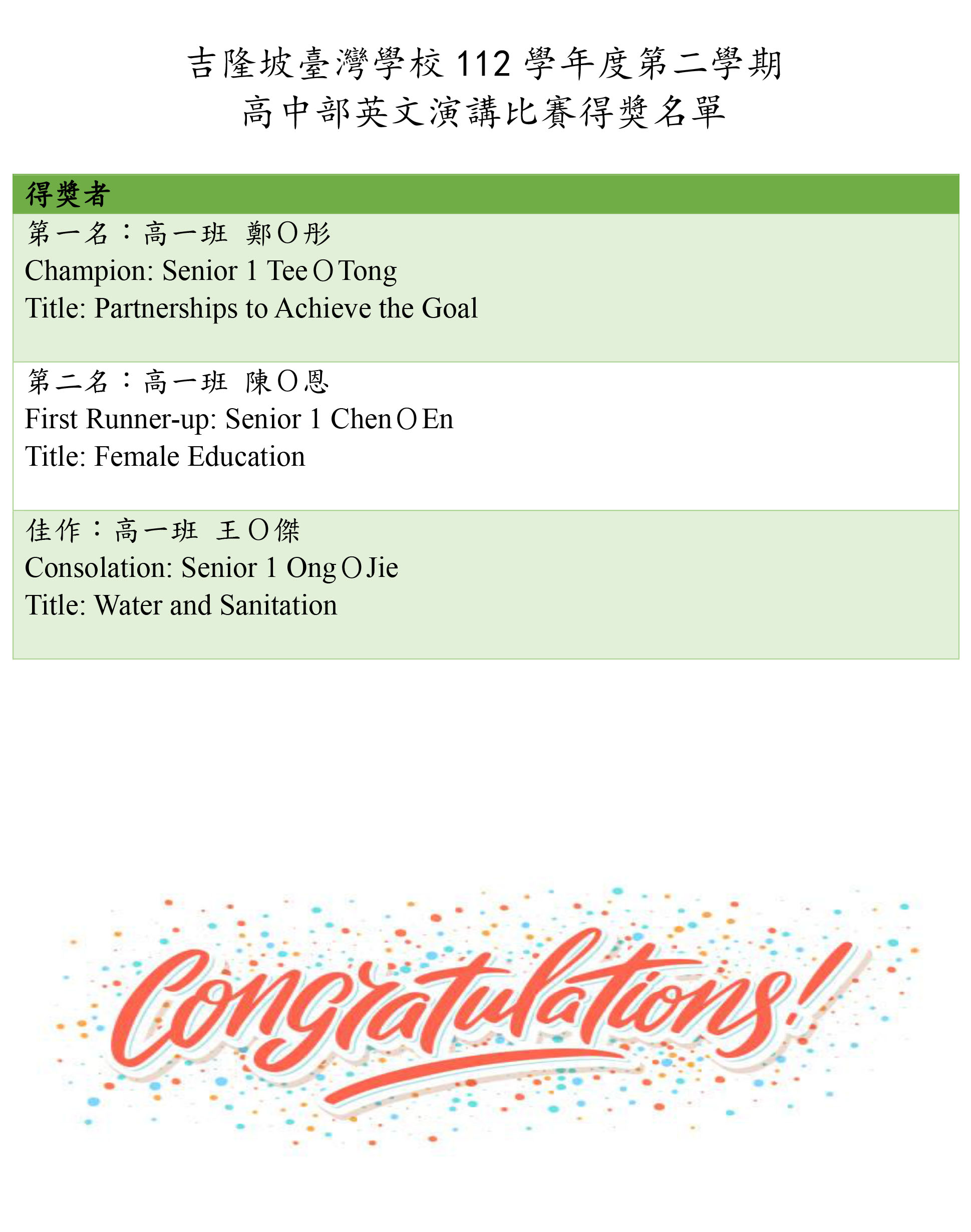 / 吉隆坡臺灣學校112學年度第二學期高中部英文演講比賽