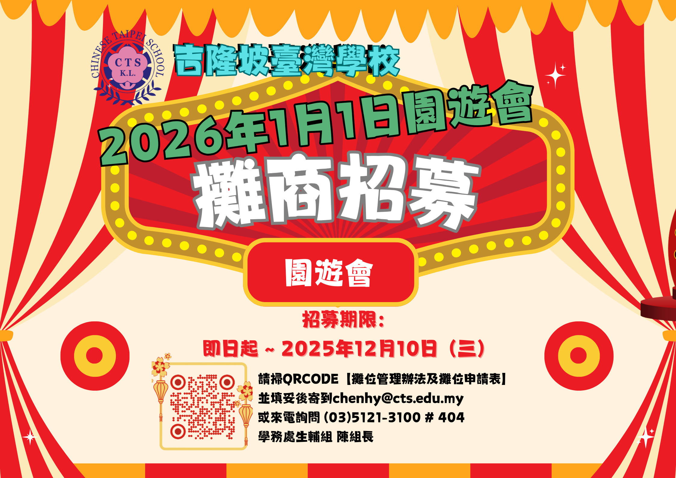 Event Details • Date: January 1st, 2026 (Thursday) • Time: 9:00 AM – 1:30 PM • Location: New Building Parking Lot, Chinese Taipei School How to Apply Download and complete the 2026 New Year’s Day Carnival Vendor Application Form. Click Here Submit the completed form by Wednesday, December 10th to: chenhy@cts.edu.my Upon approval, please pay the total amount of RM220 (RM120 rental + RM100 deposit) by Tuesday, December 16th. The RM100 deposit will be refunded within one week after the event.