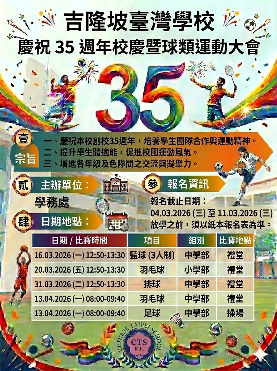 【學】吉隆坡臺灣學校 35週年校慶球類運動大會競賽辦法