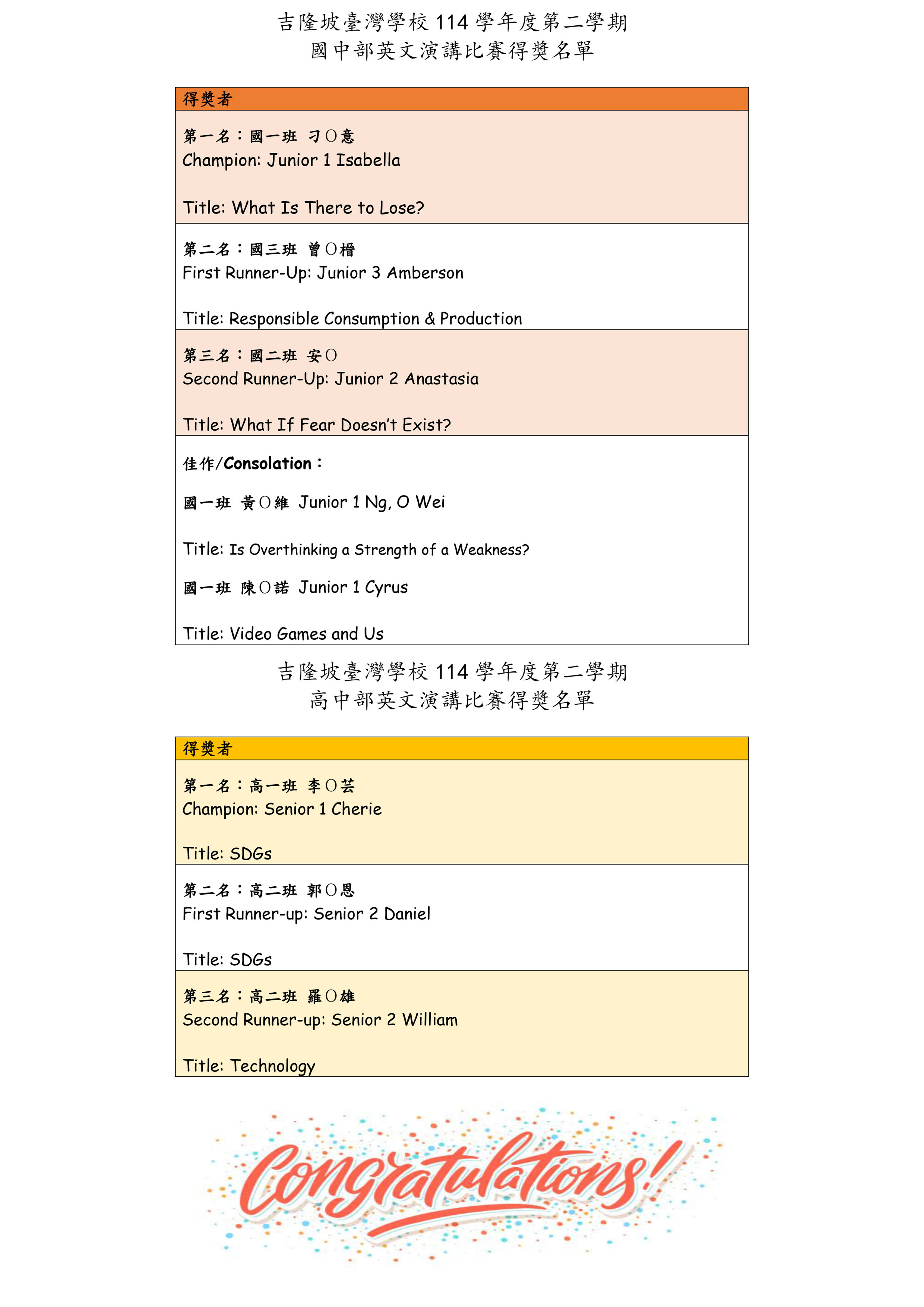 / 114學年度 第二學期 中學部英文演講比賽得獎名單